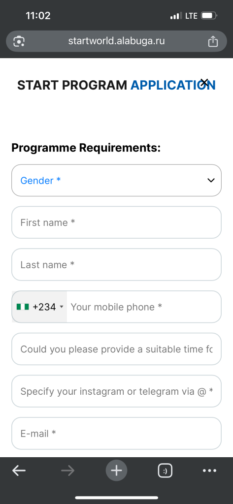 I start questioning Alabuga’s registration professionalism after I complete my short bio form on the Alabuga Start official website with name, age, and contact details.