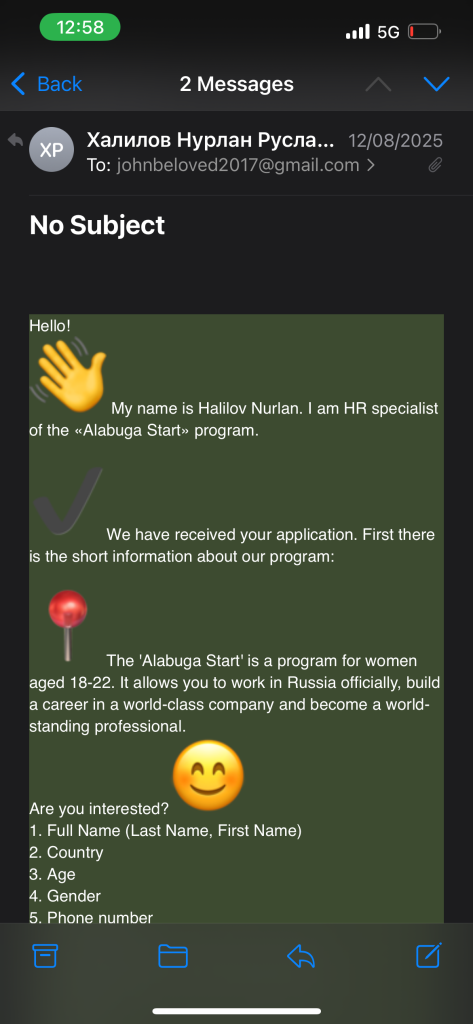 A screenshot of the email received from Alabuga “HR Specialist”.
