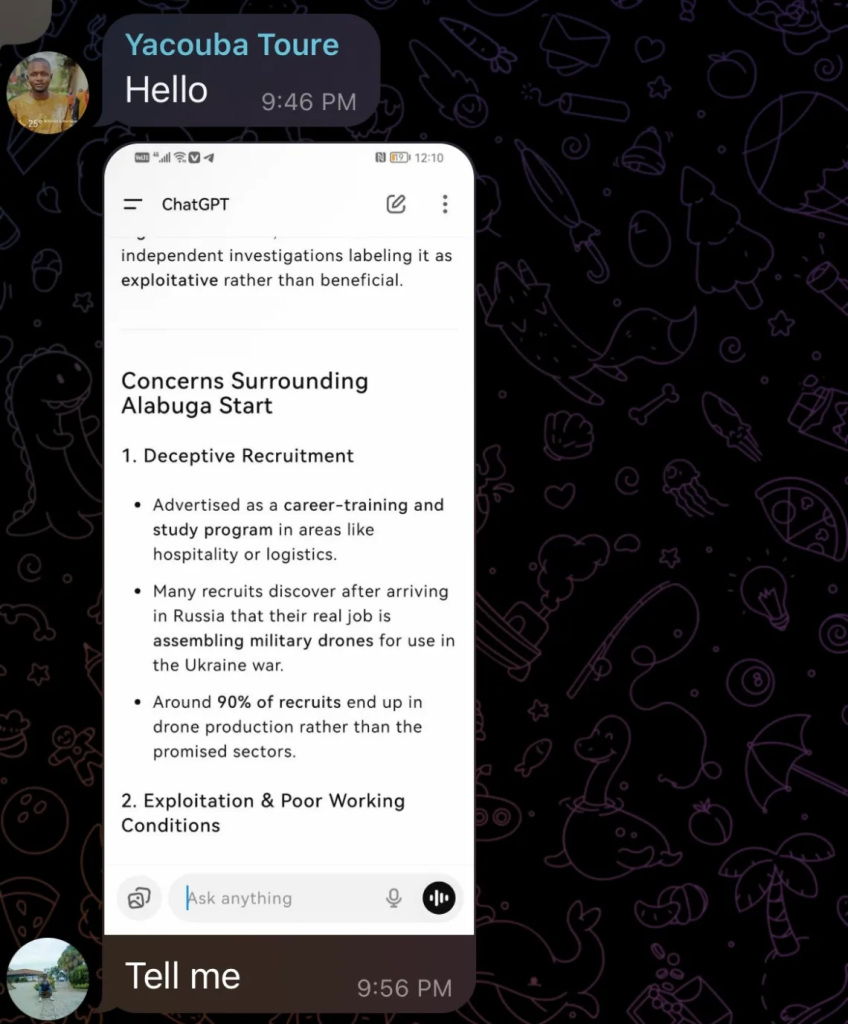 Most applicants I have been talking to have persisted throughout the dodgy process, even after having seen warnings about Alabuga. Only Fatimah Yusuf* tells me she has begun to reconsider her decision to enrol in Alabuga Start after noticing that an inquiry about the programme was quietly deleted from the Telegram group page. The deleted post, shared by an unknown user on 17 August, was a screenshot of ChatGPT’s response to a “concern about Alabuga start” prompt. The first sentence in the images reads, “deceptive recruitment,” and another reads, “exploitation and poor working conditions.” The user shared the screenshot with the caption, “Tell me.”