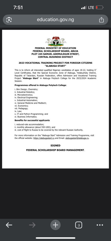 Reaching out to the Ministry of Education to inquire why the Alabuga scholarship is on its website, I was directed to the Federal Scholarship Board, which, I am told, oversees such listings. A response from FSB director Ndajiwo Asta states that neither her agency nor the ministry itself has “involvement” with the Alabuga project. “Whatever is on the website, it was made by fraudulent persons trying to use the ministry. We have never issued any statement endorsing Alabuga,” Ms Asta says. “The Ministry did not authorise it. Let the public know about this. Anyone can draft a letter and upload it to a known website.”