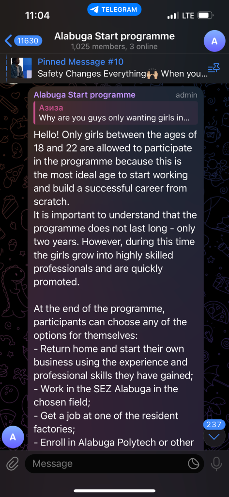As a result, it’s not just young people themselves who flock to the Alabuga opportunity. In the Telegram channel, but also in a dedicated WhatsApp group, I even find parents trying to enrol their daughters, siblings trying to research or ask follow-up questions on behalf of relatives, and prospective applicants seeking guidance on the admission process.